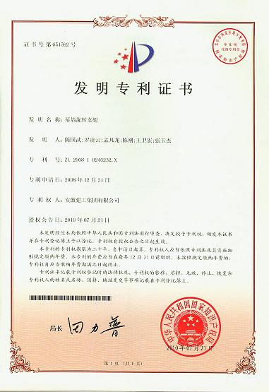 2010年7月21日,國家知識產(chǎn)權局授予安徽建工集團“幕墻旋轉支架”發(fā)明專(zhuān)利權,并頒發(fā)了“發(fā)明專(zhuān)利證書(shū)”。