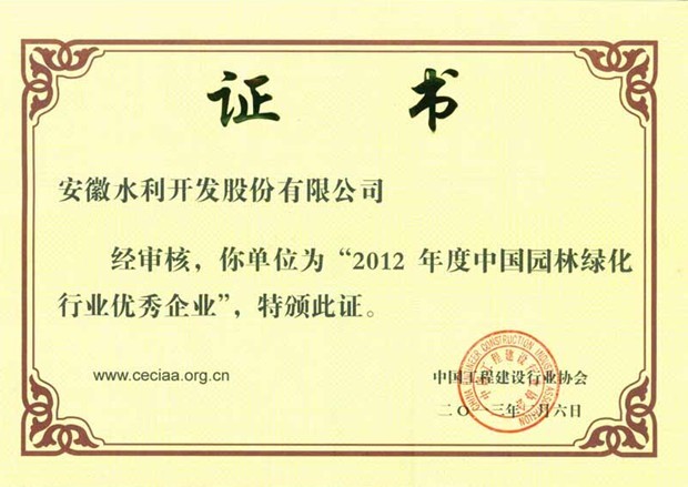 安徽水利榮獲“2012年度中國園林綠化行業(yè)優(yōu)秀企業(yè)”等榮譽(yù)稱(chēng)號