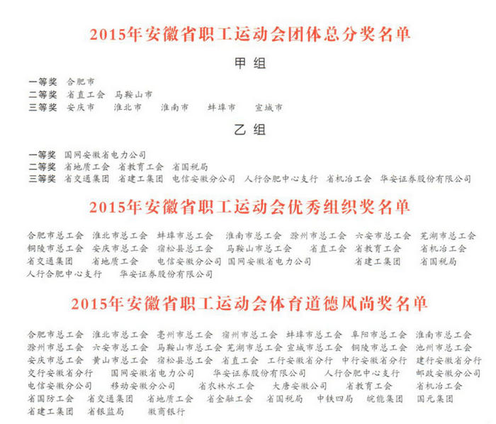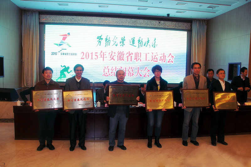 11月16日,“勞動(dòng)光榮•運動(dòng)快樂(lè )”2015年安徽省職工運動(dòng)會(huì )總結閉幕大會(huì )在合肥召開(kāi)。會(huì )議對本屆運動(dòng)會(huì )優(yōu)勝單位進(jìn)行表彰。安徽建工集團代表隊經(jīng)過(guò)團結拼搏,取得優(yōu)異成績(jì),獲得運動(dòng)會(huì )團體總分獎乙組三等獎,并被運動(dòng)會(huì )組委會(huì )授予“優(yōu)秀組織獎”和“體育道德風(fēng)尚獎”榮譽(yù)稱(chēng)號。