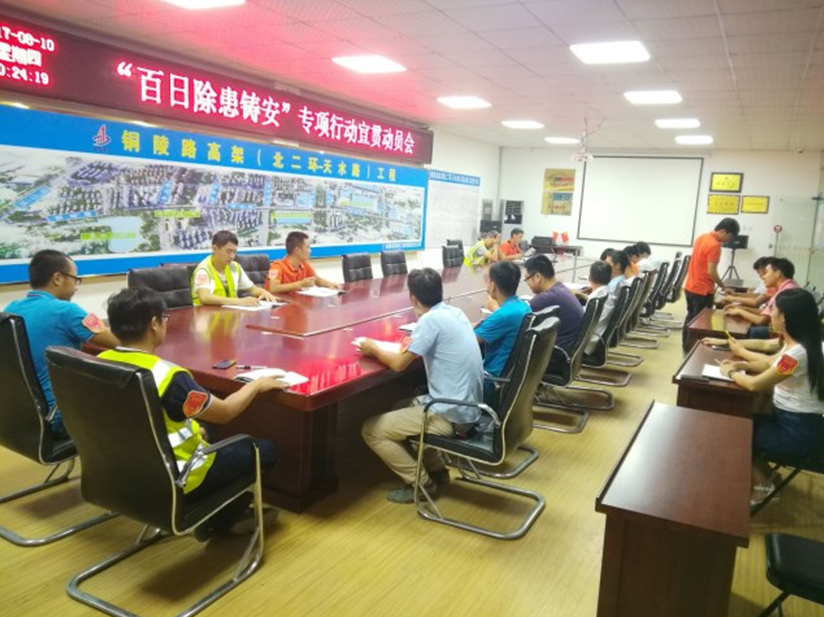 8月10日晚,安徽路港銅陵路高架項目部組織召開(kāi)“百日除患鑄安”動(dòng)員大會(huì ),項目部全體職工、“青安崗”成員及班組長(cháng)約30人參加,項目部安全部長(cháng)曹志強主持會(huì )議。