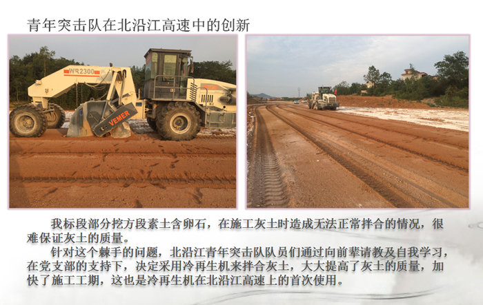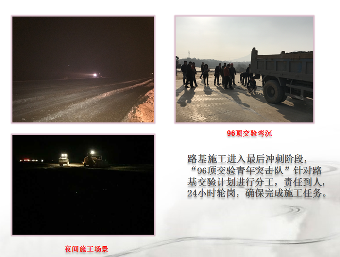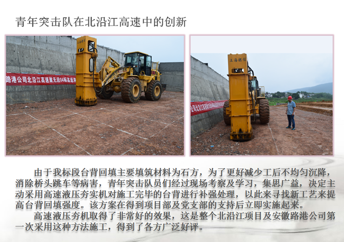 在工程建設中,該青年突擊隊圍繞“急、難、新、險、重”的任務(wù)開(kāi)展了一系列活動(dòng)。一是成立“96頂交驗青年突擊隊”,針對路基交驗計劃進(jìn)行分工,責任到人,24小時(shí)輪崗,加快了施工進(jìn)度;二是立足崗位,創(chuàng )新創(chuàng )效,采用高速液壓夯實(shí)機的創(chuàng )新工藝對臺背回填質(zhì)量進(jìn)行補強,采用冷再生機拌合灰土提高灰土質(zhì)量,加快施工工期;三是規范要求,精細交底保安全,組織開(kāi)展各類(lèi)質(zhì)量安全文明進(jìn)班組和質(zhì)量安全自查自糾活動(dòng),對施工人員進(jìn)行了現場(chǎng)工序施工可視化技術(shù)交底,切實(shí)提高職工質(zhì)量安全意識,青年職工的智慧在青年文明號創(chuàng )建過(guò)程中得以彰顯和應用。