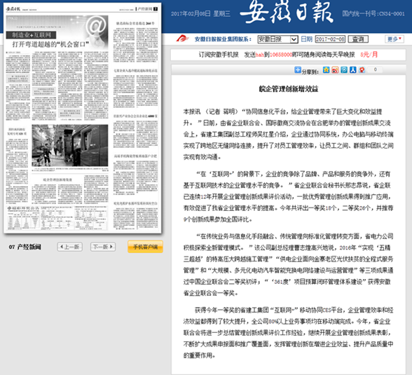 2月8日,《安徽日報》在產(chǎn)經(jīng)新聞版塊中發(fā)表《皖企管理創(chuàng )新增效益》一文,文章高度評價(jià)集團CES協(xié)同平臺建設成效。
