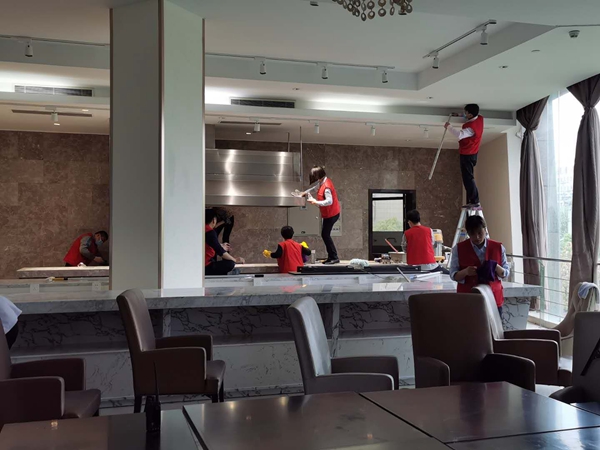 合肥酒店黨支部組織全體黨員、中層管理人員及青年員工成立“衛生清潔突擊隊”和“餐飲保障突擊隊”,對7個(gè)餐飲宴會(huì )廳進(jìn)行衛生保潔工作,全力以赴保障五一婚宴服務(wù)。