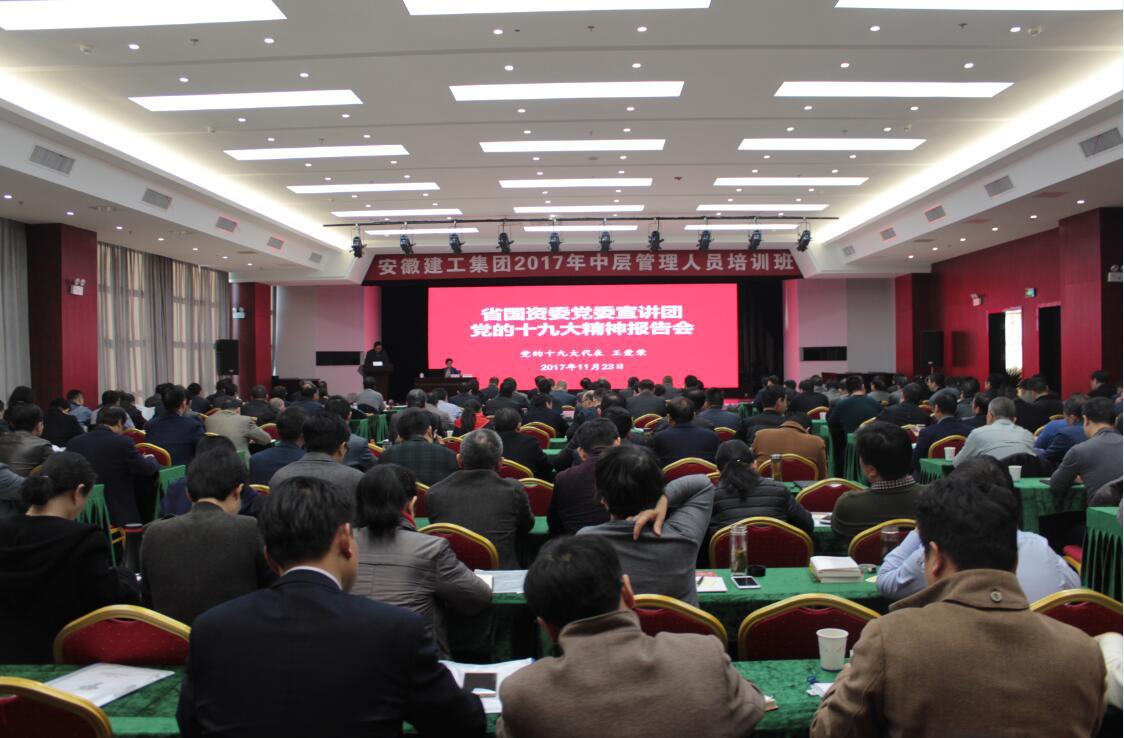 2017年11月23日上午,省國資委黨委宣講團成員,黨的十九大代表、銅陵有色稀貴金屬分公司化工高級技術(shù)主管王愛(ài)榮同志應邀到安徽建工集團宣講黨的十九大精神。集團公司黨委書(shū)記、董事長(cháng)趙時(shí)運和集團領(lǐng)導班子成員,所屬單位領(lǐng)導班子成員,集團機關(guān)部門(mén)負責人,統戰人士代表,共260余人聆聽(tīng)了報告會(huì )。集團公司黨委副書(shū)記牛曙東主持報告會(huì )。