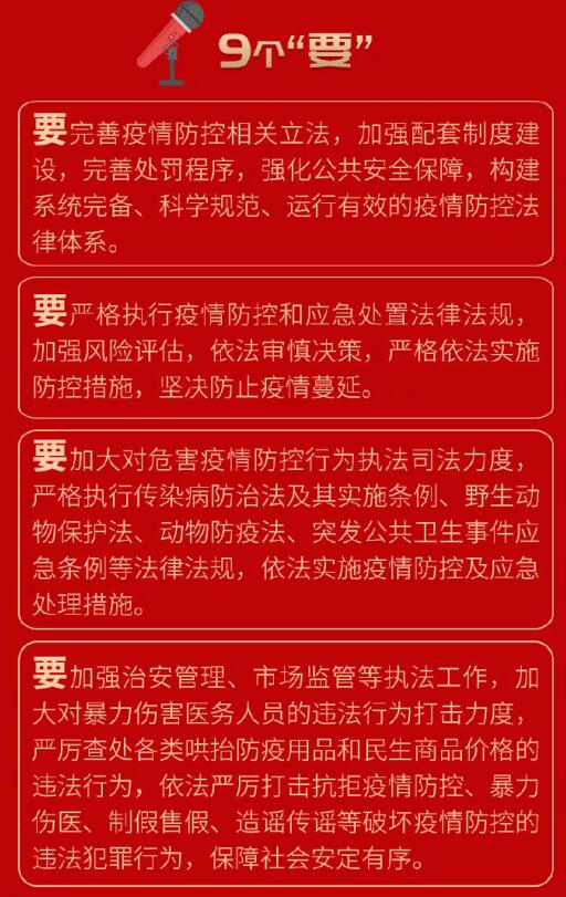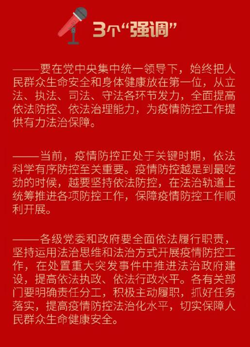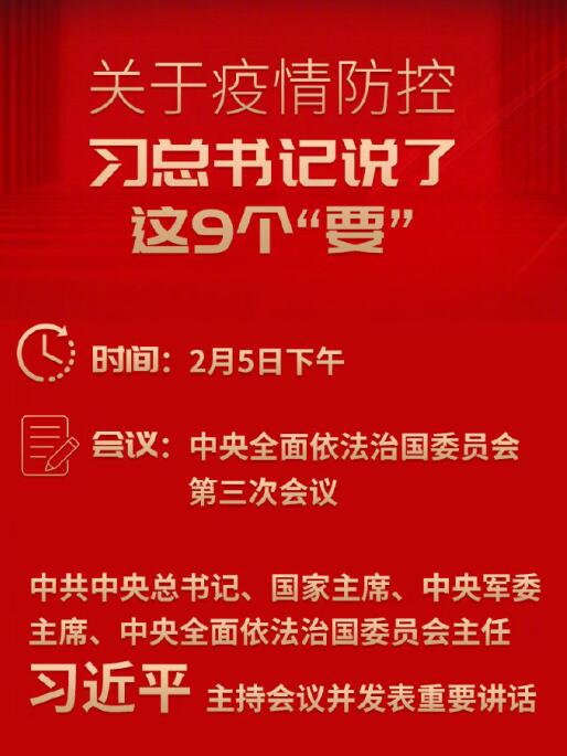 2月5日下午,中共中央總書(shū)記、國家主席、中央軍委主席、中央全面依法治國委員會(huì )主任習近平主持召開(kāi)中央全面依法治國委員會(huì )第三次會(huì )議強調,全面提高依法防控依法治理能力,為疫情防控提供有力法治保障。
