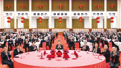 人民大會(huì )堂宴會(huì )廳燈光璀璨、暖意融融,各界人士約1000人歡聚一堂、共迎新春,歡聲笑語(yǔ)間洋溢著(zhù)喜慶祥和的節日氣氛。