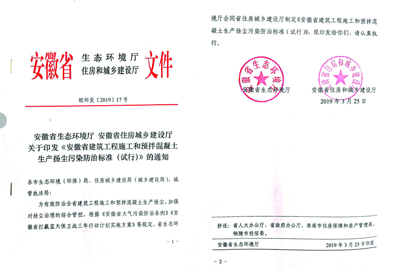 近日, 安徽省生態(tài)環(huán)境廳和安徽省住房和城鄉建設廳聯(lián)合發(fā)布了由安徽建工集團控股有限公司共同主編的《安徽省建筑工程施工和預拌混凝土生產(chǎn)揚塵污染防治標準(試行)》(以下簡(jiǎn)稱(chēng)《標準》)。