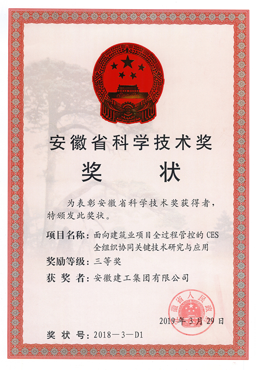 4月11日,安徽省科學(xué)技術(shù)獎勵大會(huì )在合肥隆重召開(kāi),省委書(shū)記李錦斌,中科院院長(cháng)白春禮,省長(cháng)李國英等出席大會(huì ),集團公司主持申報的《面向建筑業(yè)項目全過(guò)程管控的CES全組織協(xié)同關(guān)鍵技術(shù)研究與應用》榮獲安徽省科技進(jìn)步獎三等獎,這是集團公司信息化建設過(guò)程中首次獲得的安徽省科學(xué)技術(shù)獎。