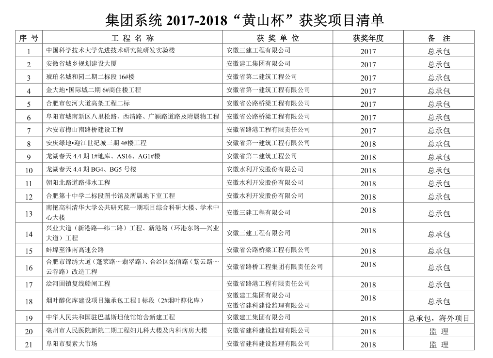 近日,安徽省住房和城鄉建設廳發(fā)布《關(guān)于公布2017-2018年度安徽省建設工程“黃山杯”獲獎項目名單的通知》(建質(zhì)函[2019]687),全省共有162個(gè)項目獲獎,其中集團系統共有安建海外公司承建的中華人民共和國駐巴基斯坦使館館舍新建工程、安徽三建承建的中國科學(xué)技術(shù)大學(xué)先進(jìn)技術(shù)研究院研發(fā)實(shí)驗樓等21項工程榜上有名,獲獎工程數量占總量的13%;集團所屬施工板塊10家單位有8家獲獎,另外安徽建科監理公司作為監理單位參報也獲得了2項“黃山杯”,總體成績(jì)喜人,體現了集團公司工程建設整體較高的質(zhì)量管理水平。