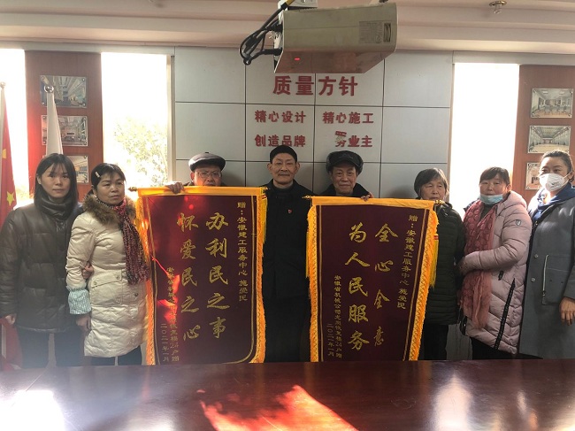 1月12日上午,服務(wù)中心迎來(lái)了一群熱情洋溢的居民,手捧兩面分別寫(xiě)有“辦利民之事,懷愛(ài)民之心”、“全心全意為人民服務(wù)”的錦旗,原來(lái)是安徽省機械施工公司龍崗集資樓24戶(hù)代表為感謝服務(wù)中心黨總支書(shū)記、總經(jīng)理施愛(ài)民同志盡職盡責、不計得失、辛勤付出,為他們解決了12年來(lái)的“急難愁盼”問(wèn)題。他們一到來(lái),其中一位代表就說(shuō)施總你好,感謝你為我們解決了多年的難題,為群眾辦了實(shí)事,我們今天特地送上錦旗表達感激之情……”。