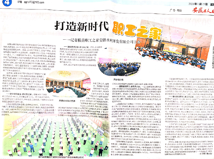 編者按:2021年1月15日,安徽工人日報以《打造新時(shí)代職工之家——記省模范職工之家安徽水利開(kāi)發(fā)有限公司工會(huì )》為題,刊發(fā)了安徽水利工會(huì )獲評安徽省模范職工之家的深度報道,對安徽水利​工會(huì )圍繞中心、服務(wù)大局,加強自身建設,推動(dòng)企業(yè)高質(zhì)量發(fā)展等方面的經(jīng)驗做法給予了重點(diǎn)推介。