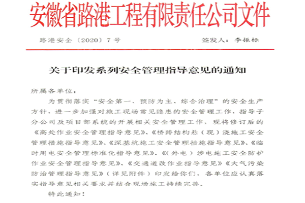 “十三五”期間,公司進(jìn)一步細化安全管理要求,印發(fā)《設備操作規程》《安全設施標準化圖集》,編制下發(fā)了高處作業(yè)、橋跨結構懸(現)澆施工、深基坑施工、臨時(shí)用電安全管理標準化、(外電)涉電施工安全防護、施工現場(chǎng)車(chē)輛交通、大氣污染防治管理、安全應急管理等系列指導意見(jiàn),指導施工現場(chǎng)開(kāi)展安全管理工作,目前均得到有效落實(shí)。
