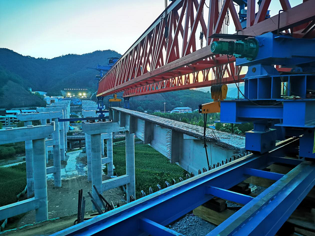 伊河大橋為左右分離式大橋,跨地方水泥路、國道311和伊河,沿線(xiàn)有不少村莊住戶(hù),對施工安全環(huán)保方面有更高要求。為此項目部專(zhuān)門(mén)增設灑水車(chē)、霧炮以及噴淋系統,并用硬質(zhì)擋板與居民生活區分開(kāi)。伴隨著(zhù)機械的轟鳴聲,牽引車(chē)將T梁緩緩運至施工點(diǎn)位,經(jīng)過(guò)施工人員半個(gè)小時(shí)的努力,提梁、位移、落梁等工序一氣呵成,T梁一次安裝就位,在場(chǎng)人員共同見(jiàn)證了這激動(dòng)人心的時(shí)刻。