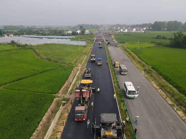 【奮戰勞動(dòng)競賽 獻禮百年華誕】路橋集團S244羅崗至分路口公路工程02標完成全線(xiàn)首個(gè)瀝青上面層試驗段攤鋪