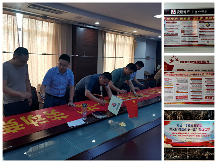 為了激發(fā)職工主人翁精神,營(yíng)造出人人參與的良好氛圍,阜陽(yáng)公司召開(kāi)會(huì )議對勞動(dòng)競賽進(jìn)行再動(dòng)員再部署,并舉辦鄭重的簽名儀式。同時(shí),在銷(xiāo)售案場(chǎng)、辦公區,制作宣傳展板3個(gè),主要宣傳習近平總書(shū)記在建黨100周年大會(huì )上的講話(huà)、勞動(dòng)競賽主題、黨史學(xué)習教育的要求等。