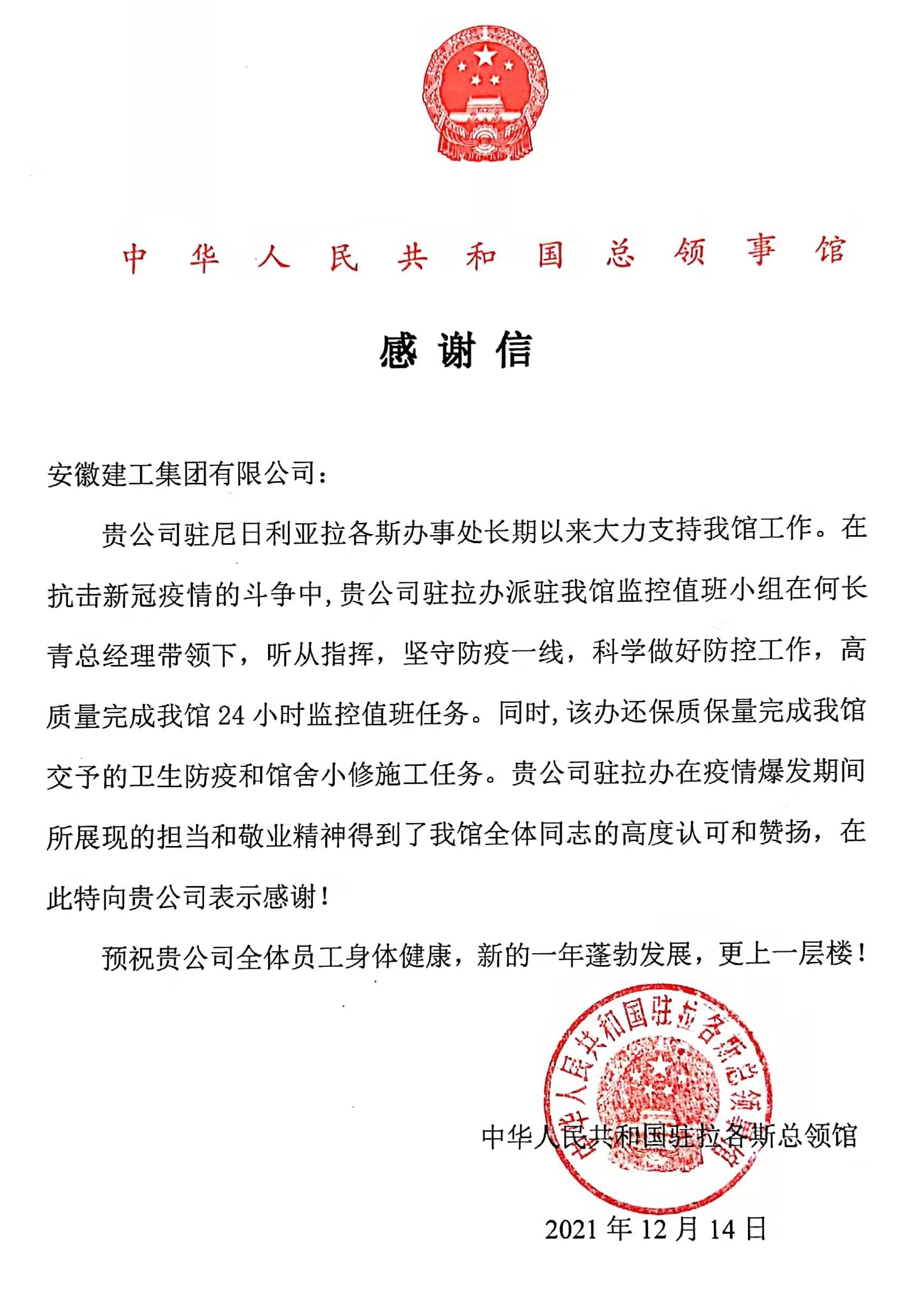 安徽建工集團收到中國駐拉各斯總領(lǐng)館感謝信