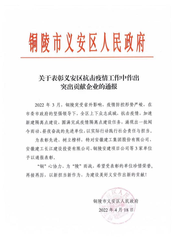 安徽建工和長(cháng)江建投獲銅陵市義安區政府通報表彰