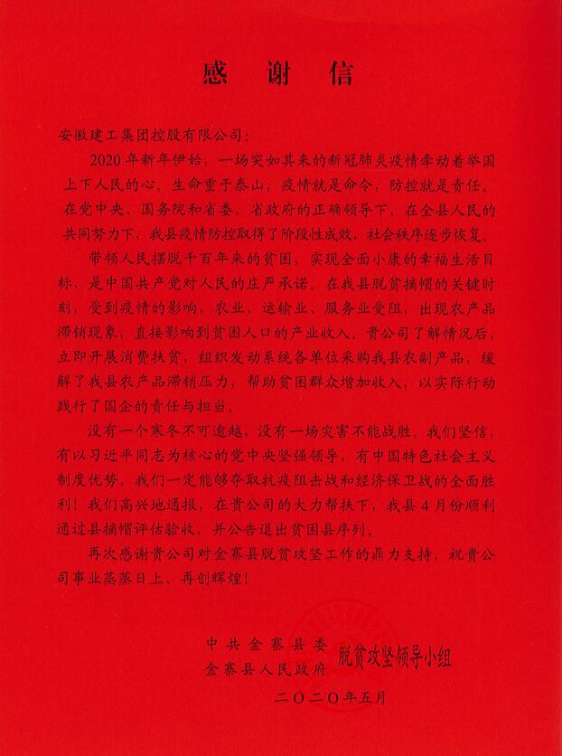 近日,集團收到中共金寨縣委、金寨縣人民政府脫貧攻堅領(lǐng)導小組的感謝信,對集團在疫情期間大力開(kāi)展消費扶貧,幫助金寨縣解決農副產(chǎn)品滯銷(xiāo)問(wèn)題的義舉給予了高度評價(jià)和衷心感謝。