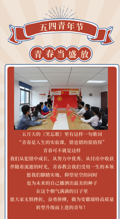 在五四青年節來(lái)臨之際,安徽瑞特團支部組織觀(guān)看《電影黨課:五四精神》微視頻,點(diǎn)燃青年職工愛(ài)國熱情;通過(guò)召開(kāi)五四青年職工在專(zhuān)題座談會(huì )面對面交流分享建團百年心得感悟、重溫入團誓詞、與團旗合影,進(jìn)一步筑牢愛(ài)國、愛(ài)企情懷;在五四青年節當天,團支部發(fā)出五四青春寄語(yǔ),引導青年職工將五四精神融入青年奮斗,譜寫(xiě)新時(shí)代華章,為公司高質(zhì)量轉型升級貢獻青年力量。