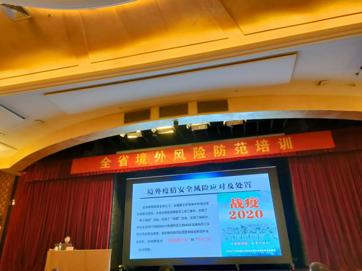 7月15日下午,安徽建工集團股份公司副總經(jīng)理,海外事業(yè)部黨總支書(shū)記、總經(jīng)理邢應梅應邀參加全省境外風(fēng)險防范培訓班并作《企業(yè)境外安全風(fēng)險防范》專(zhuān)題授課。該培訓由安徽省商務(wù)廳主辦,安徽省各地市商務(wù)主管部門(mén)負責人和省內外經(jīng)外貿企業(yè)負責人近200人參加培訓。