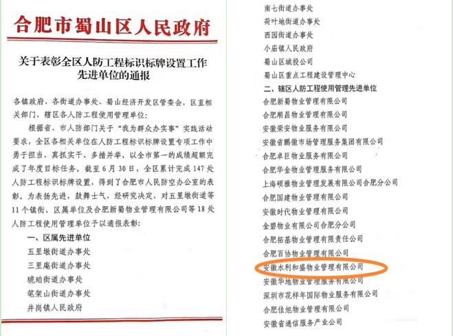 近日,集團物業(yè)安徽水利和盛物業(yè)獲合肥市蜀山區人民政府通報表?yè)P,榮獲合肥市蜀山區人防工程使用管理先進(jìn)單位稱(chēng)號。