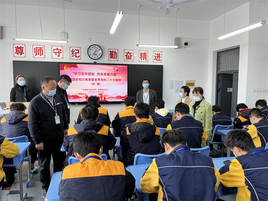 為深入宣傳貫徹黨的二十大精神,慶祝中國共青團成立一百周年,學(xué)習習近平新時(shí)代中國特色社會(huì )主義思想及關(guān)于青年工作的重要思想,推動(dòng)廣大學(xué)生對黨團史知識的進(jìn)一步學(xué)習,真正達到以賽促學(xué),以學(xué)促用目的,安徽建工技師學(xué)院團委舉辦了“學(xué)習百年團史,傳承青春力量”黨團史知識競賽暨宣貫黨的二十大精神活動(dòng)。學(xué)院黨委委員、副院長(cháng)任建設親臨競賽現場(chǎng)指導,院長(cháng)助理曹新彩、德育工作部主任楊繼強、紀委副書(shū)記王海及相關(guān)部門(mén)負責人觀(guān)摩了競賽。