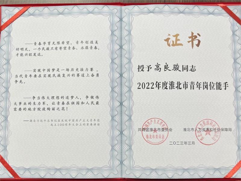 建材科技三分公司高良駿獲得2022年度淮北市青年崗位能手稱(chēng)號