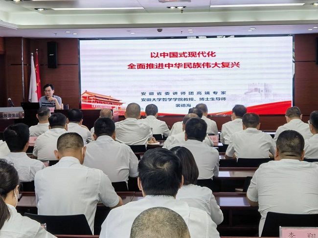 培訓邀請到安徽省委宣講團高端專(zhuān)家,安徽大學(xué)哲學(xué)學(xué)院教授、博士生導師裴德海進(jìn)行授課。裴教授通過(guò)《以中國式現代化全面推進(jìn)中華民族偉大復興》這一主題,系統闡釋了什么是“中國式現代化”、“中國式現代化”的本質(zhì)要求、“中國式現代化”理論背景和依據、“中國式現代化”總體戰略安排、實(shí)現“中國式現代化”必須牢牢把握的準則等內容,梳理了中國式現代化的發(fā)展脈絡(luò ),幫助大家理解和學(xué)習了中國式現代化的深刻內涵及重大意義。廣大學(xué)員紛紛表示,作為黨員領(lǐng)導干部,要在黨的領(lǐng)導下,始終保持“闖”的精神、“創(chuàng )”的勁頭、“干”的作風(fēng),堅定信念,踏實(shí)工作,自覺(jué)肩負起建設中國特色社會(huì )主義現代化強國的歷史使命,為開(kāi)創(chuàng )公司高質(zhì)量發(fā)展新局面凝聚磅礴力量。