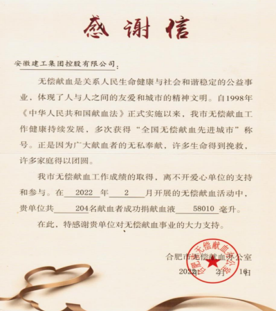 2月15日,正值元宵佳節,為進(jìn)一步推進(jìn)“我為群眾辦實(shí)事”實(shí)踐活動(dòng)走深走實(shí),履行國企社會(huì )責任,弘揚正能量,集團積極響應合肥市中心血站號召,組織職工開(kāi)展2022年無(wú)償獻血活動(dòng)。