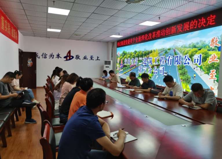 第六公司黨支部傳達學(xué)習安徽建工集團全面深化改革推動(dòng)創(chuàng )新發(fā)展動(dòng)員部署暨主題教育黨課報告會(huì )精神。會(huì )議要求,一要提高政治站位,統一思想認識,充分認識到集團深化改革推動(dòng)創(chuàng )新發(fā)展是一項意義重大、影響深遠的綜合性改革,是集團在新起點(diǎn)上,把握新形勢新要求,謀劃新思路新發(fā)展的舉措,要全面貫徹落實(shí)建工控股黨委的決策部署,認真把握集團全面深化改革推動(dòng)創(chuàng )新發(fā)展的歷史使命;二要緊緊圍繞集團戰略部署和工作安排,進(jìn)一步樹(shù)立為集團大發(fā)展、轉型發(fā)展、高質(zhì)量發(fā)展作貢獻的責任和擔當意識;三要認真落實(shí)集團工作安排,進(jìn)一步做好市場(chǎng)開(kāi)拓,搶抓市場(chǎng)先機,持續推進(jìn)項目標準化建設,嚴格落實(shí)集團、公司各項規定,樹(shù)牢風(fēng)險意識,做到“五個(gè)嚴”,持續推動(dòng)公司改革轉型、高質(zhì)量發(fā)展。