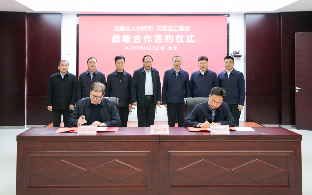 3月10日下午,安徽建工集團與金寨縣人民政府簽訂戰略合作協(xié)議。安徽建工控股黨委委員、副總經(jīng)理盛明宏與金寨縣委副書(shū)記、縣長(cháng)董益樂(lè )共同見(jiàn)證簽約,并就深化政企合作進(jìn)行座談交流。