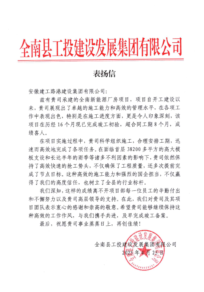 近日,建工路港收到江西省全南縣工投建設發(fā)展集團有限公司發(fā)來(lái)的表?yè)P信,信中對公司在全南縣新能源產(chǎn)業(yè)園標準廠(chǎng)房及配套基礎建設項目中的出色表現予以高度肯定。