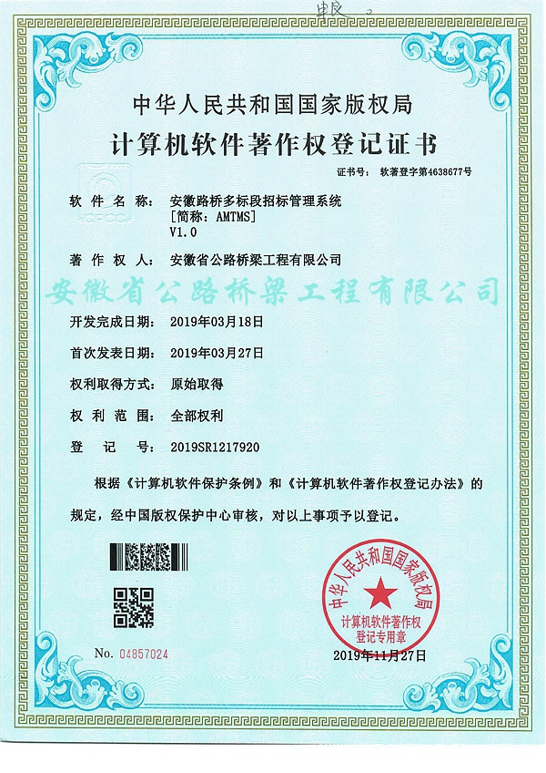 ACEG Road And Bridge Company - one of ACEG`s subsidiary - professionalized contractor for road and bridge construction engineering, has obtained 5 national computer software copyrights, issued by National Copyright Administration recently by virtue of its compilations of “ACEG Road And Bridge Company multi-bid bidding management system V1.0”, “ACEG Road And Bridge Company key performance appraisal management system V1.0” and other 3 management systems.